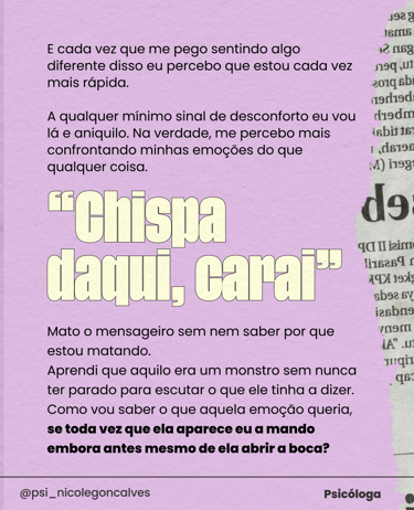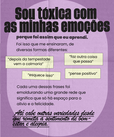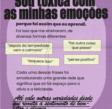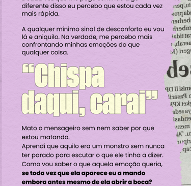 Sou tóxica com as minhas emoções porque foi assim que eu aprendi. Foi isso que me ensinaram, de diversas formas diferentes: “depois da tempestade vem a calmaria”, “esquece isso”, “faz outra coisa que passa”, “pense positivo”. Cada uma dessas frases foi emoldurando uma grande rede que significa que só há espaço para o alívio e a felicidade. Até cabe outras variedades desde que remeta a sentimento de bem-estar e alegria. E cada vez que me pego sentindo algo diferente disso eu percebo que estou cada vez mais rápida. A qualquer mínimo sinal de desconforto eu vou lá e aniquilo. Na verdade, me percebo mais confrontando minhas emoções do que qualquer coisa. “Chispa daqui, carai” Mato o mensageiro sem nem saber por que estou matando. Aprendi que aquilo era um monstro sem nunca ter parado para escutar o que ele tinha a dizer. Como vou saber o que aquela emoção queria, se toda vez que ela aparece eu a mando embora antes mesmo de ela abrir a boca?